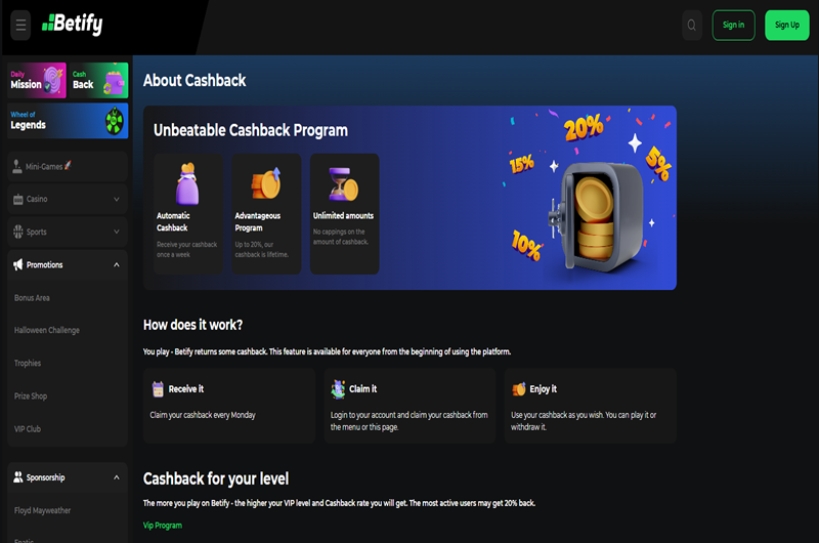 Los jugadores Betify pueden obtener un reembolso semanal todos los lunes a través del programa de recompensas de reembolso.